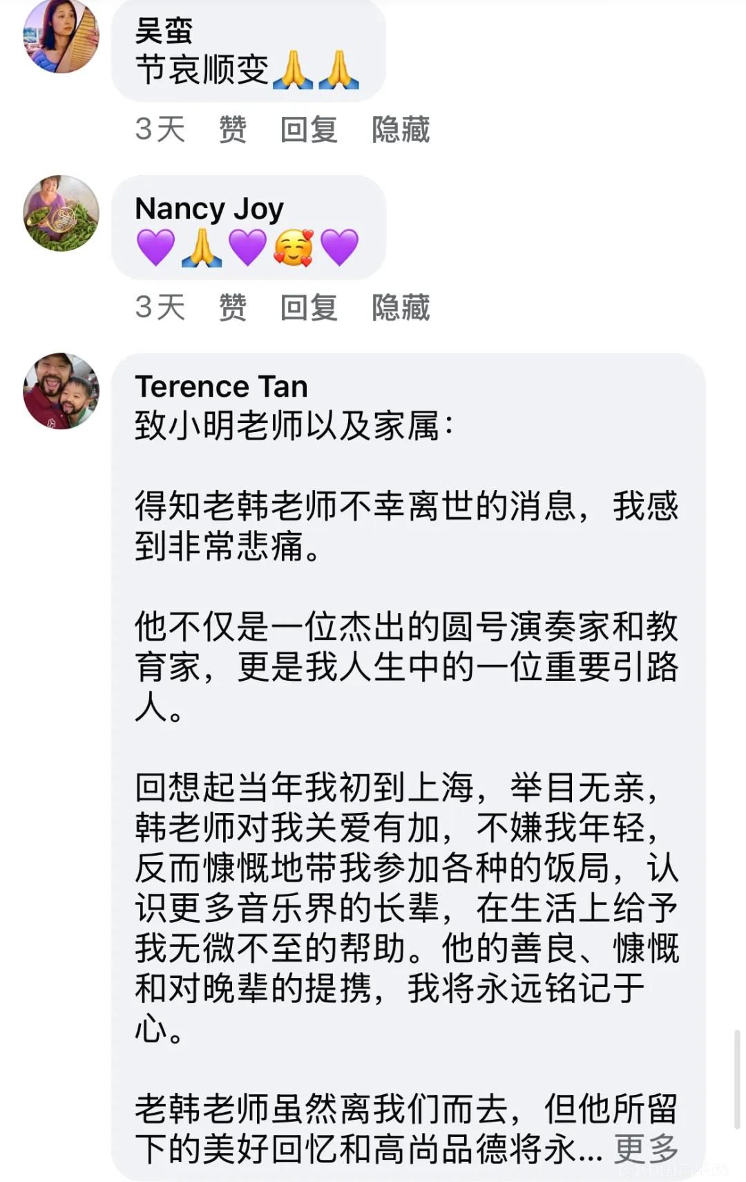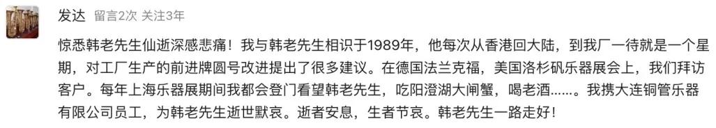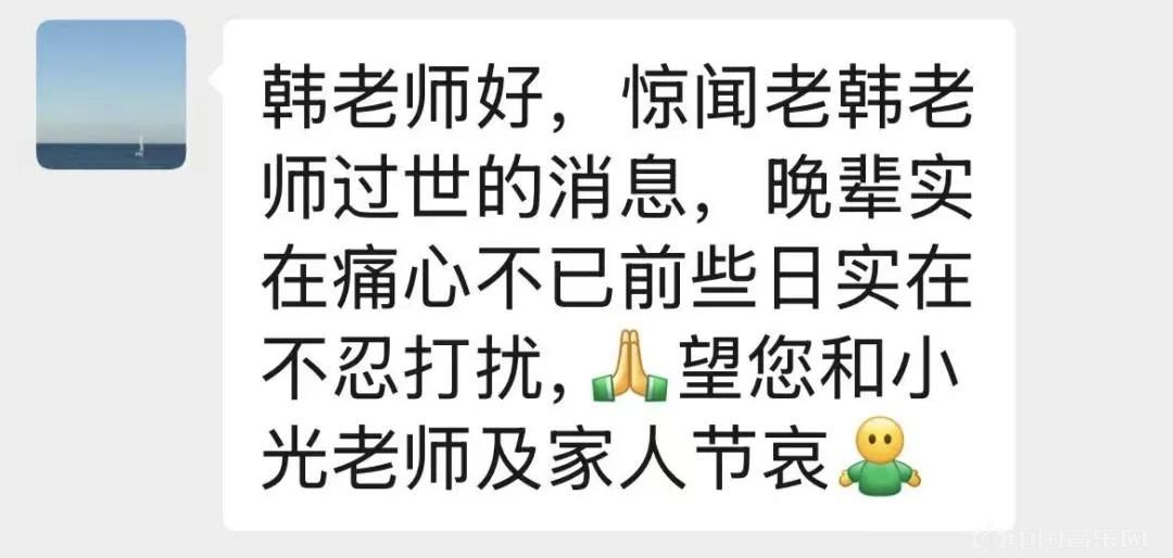 韩先生为中国圆号事业的发展,培养了大量优秀人才,教书育人,兢兢业业,做出了不可磨灭的贡献,是我们后来者的榜样!一代大师驾鹤西归,愿他老人家一路走好,天堂有他的号声!