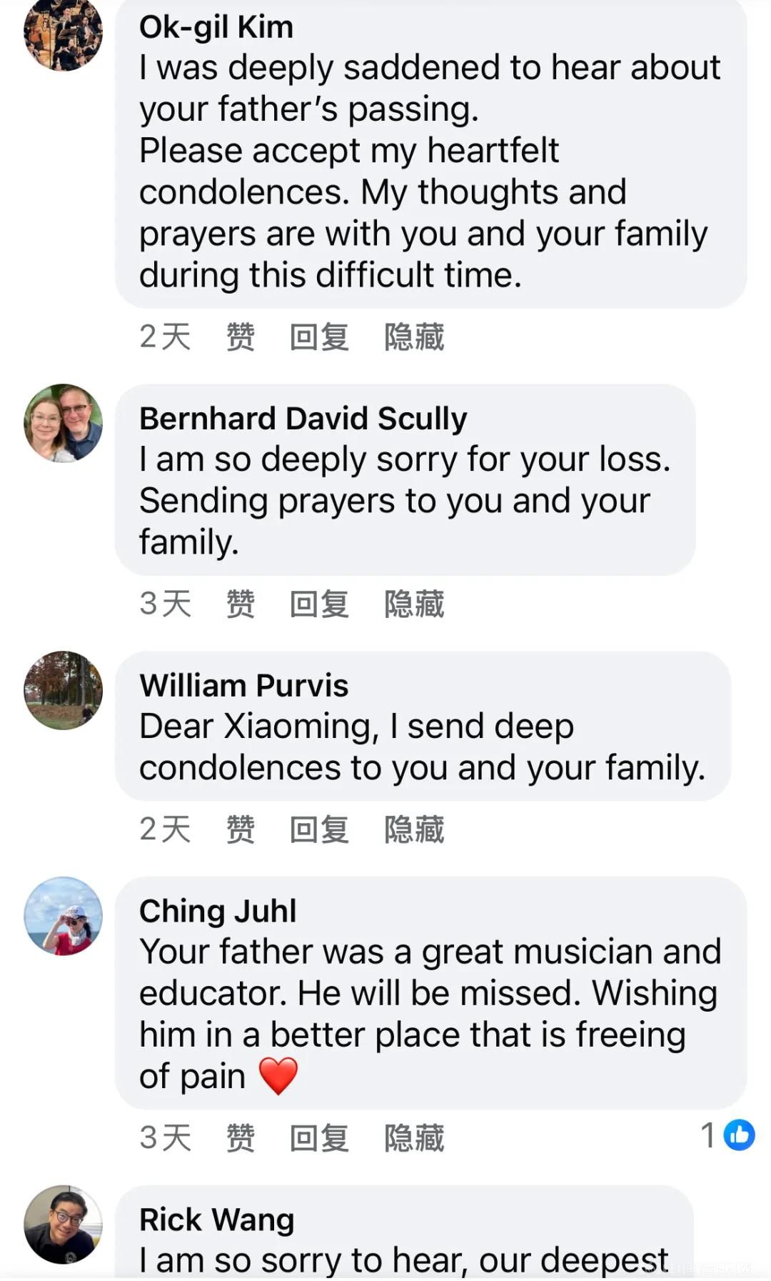 惊悉令尊驾鹤西去,不胜感慨!前辈对中国圆号以及铜管界的贡献堪称泰斗,一位划时代的引路人,他为我们树立了一座丰碑,一座灯塔,永远指引我们前进的方向。望你及全体家人节哀顺变保重身体。