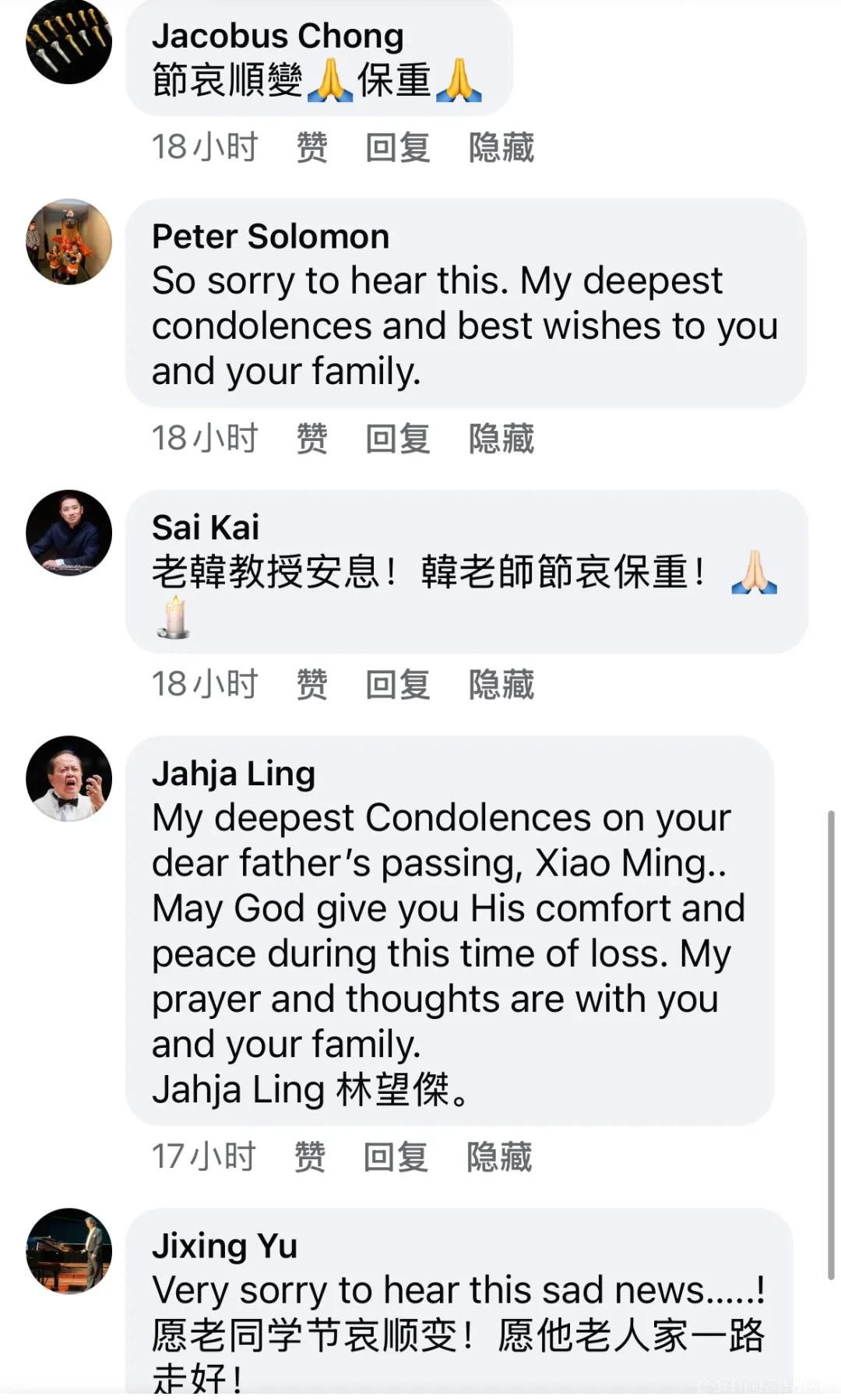 韩老师好!刚刚看到韩老先生离开的消息,和您一样深感失落和悲伤!虽然没怎么见过老先生,但他凭着自己丰富精彩的人生,以及您和全家的丰硕贡献,韩老先生必然走的无憾!望您节哀,继续向前!