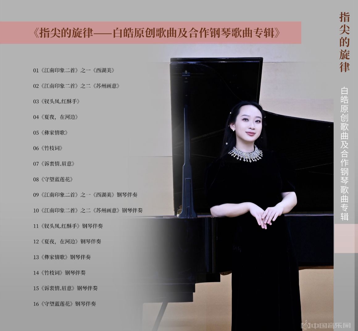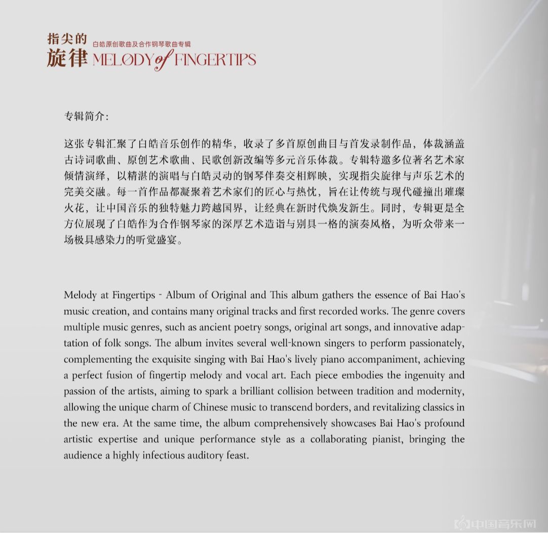 作为中国音乐学院声歌系钢琴艺术指导、国家大剧院艺术沙龙特邀讲师、“施坦威”钢琴大赛评委,白皓老师此次推出的《指尖的旋律——白皓原创歌曲及合作钢琴歌曲专辑》,收录了《西湖美》《钗头凤·红酥手》《夏夜,在河边》《竹枝词》等16首作品,这张专辑汇聚了白皓音乐创作的精华,体裁涵盖古诗词歌曲、原创艺术歌曲、民歌创新改编等多元音乐体裁。