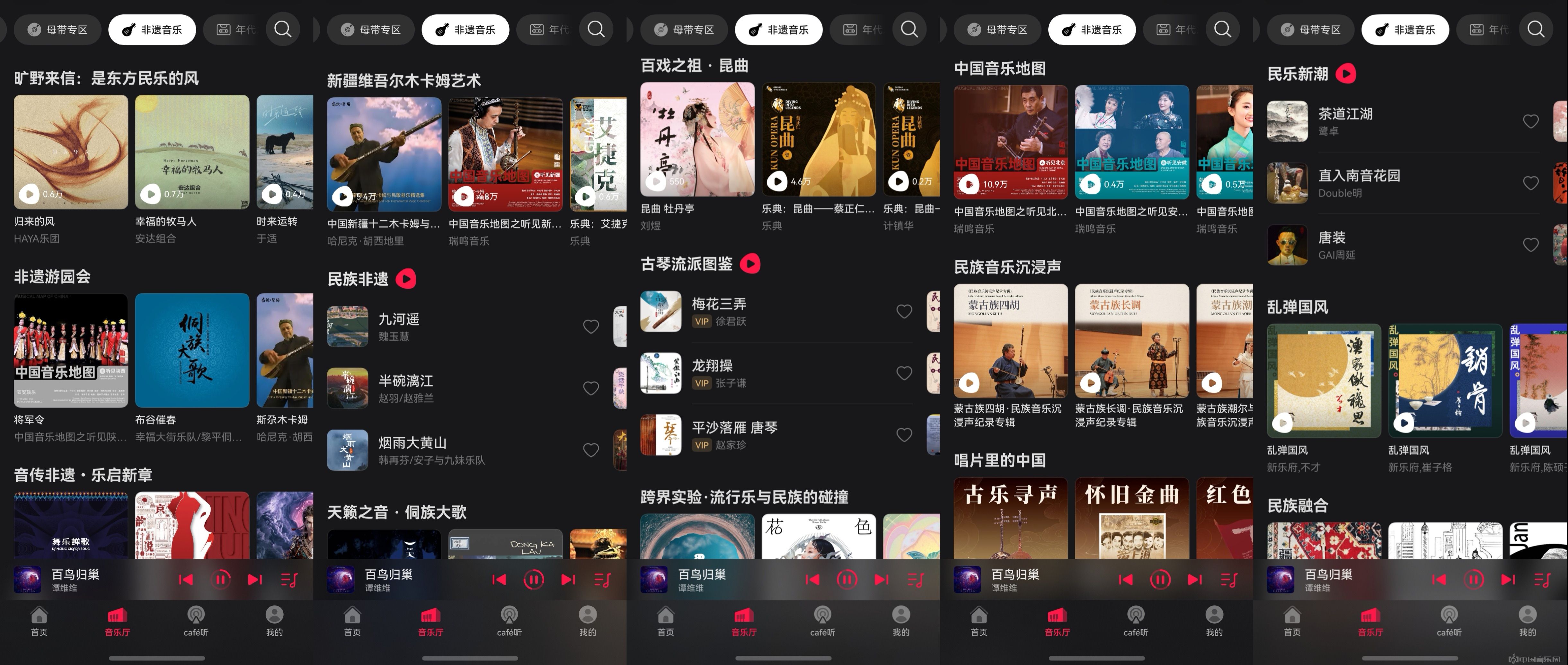 其实,这已经不是华为音乐第一次带听众在非遗中“寻音”高品质了。华为音乐在“音乐厅”版块设立“非遗音乐”专区,深色沉浸式界面搭配光影点缀,仿佛置身线下音乐会。专区内既有原汁原味的非遗古调,还有融合了电子、民谣的新派创作,这些传统旋律被赋予了新的生命力,听众可以在这里与千年前的灵魂同频共振。