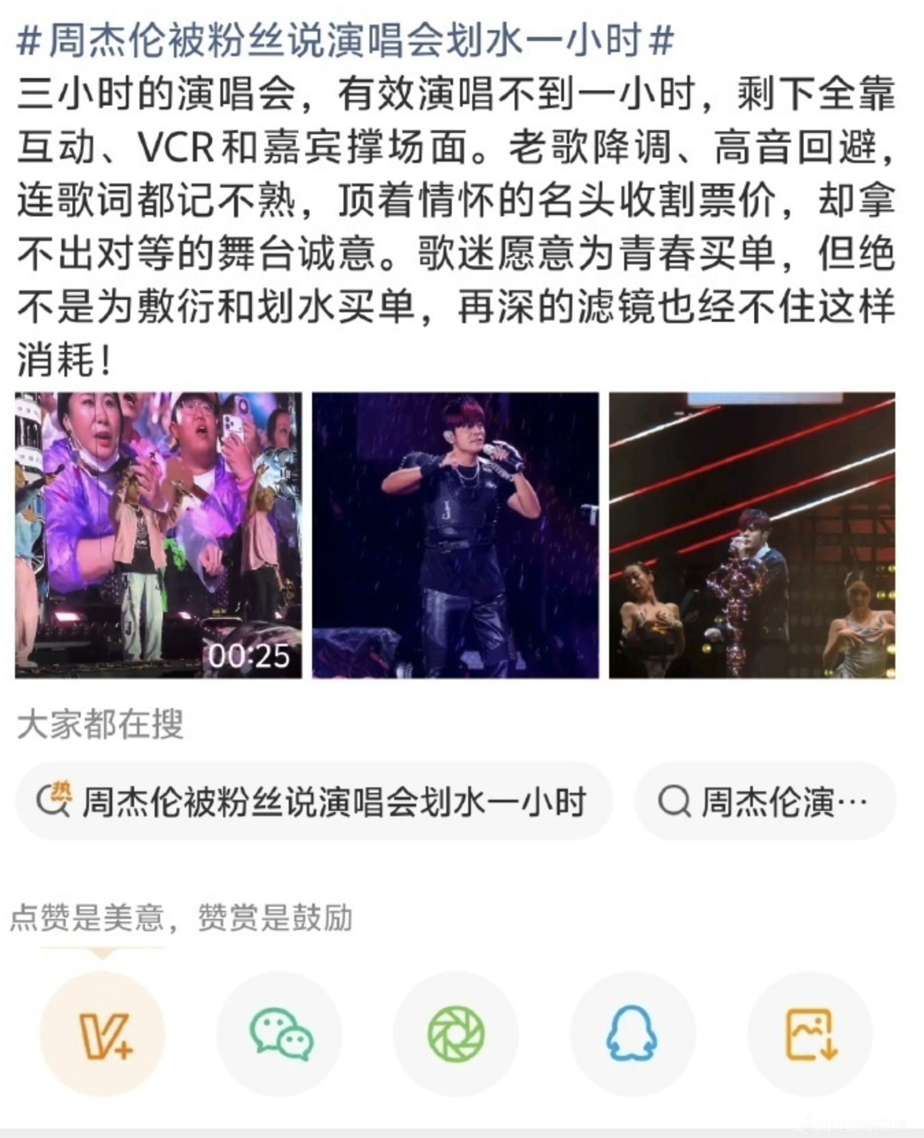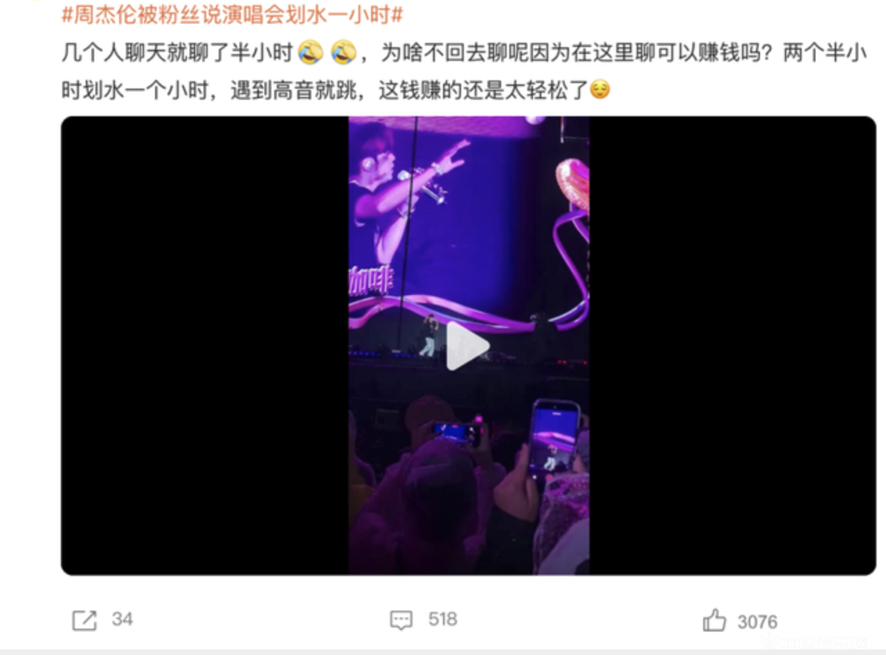 (来源:新浪 周杰伦杭州演唱会遭粉丝吐槽“划水”,降调、躲高音、嘉宾聊天撑场)