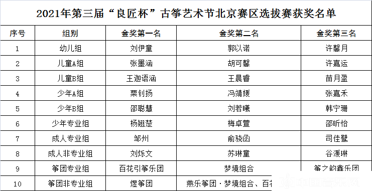 2021第三届“良匠杯”古筝艺术节暨第一届“百团大战”筝团展演北京赛区选拔赛于7月13日在中国宋庆龄青少年科技文化活动中心圆满落下帷幕,经过10个组别近300名选手的激烈角逐,评委们本着“专业、严谨、公平、公正”的原则进行评分,组委会根据评分,按照选拔赛章程的规定,按比例选手进行了各项奖项的评定。金奖前三名获奖名单如下: