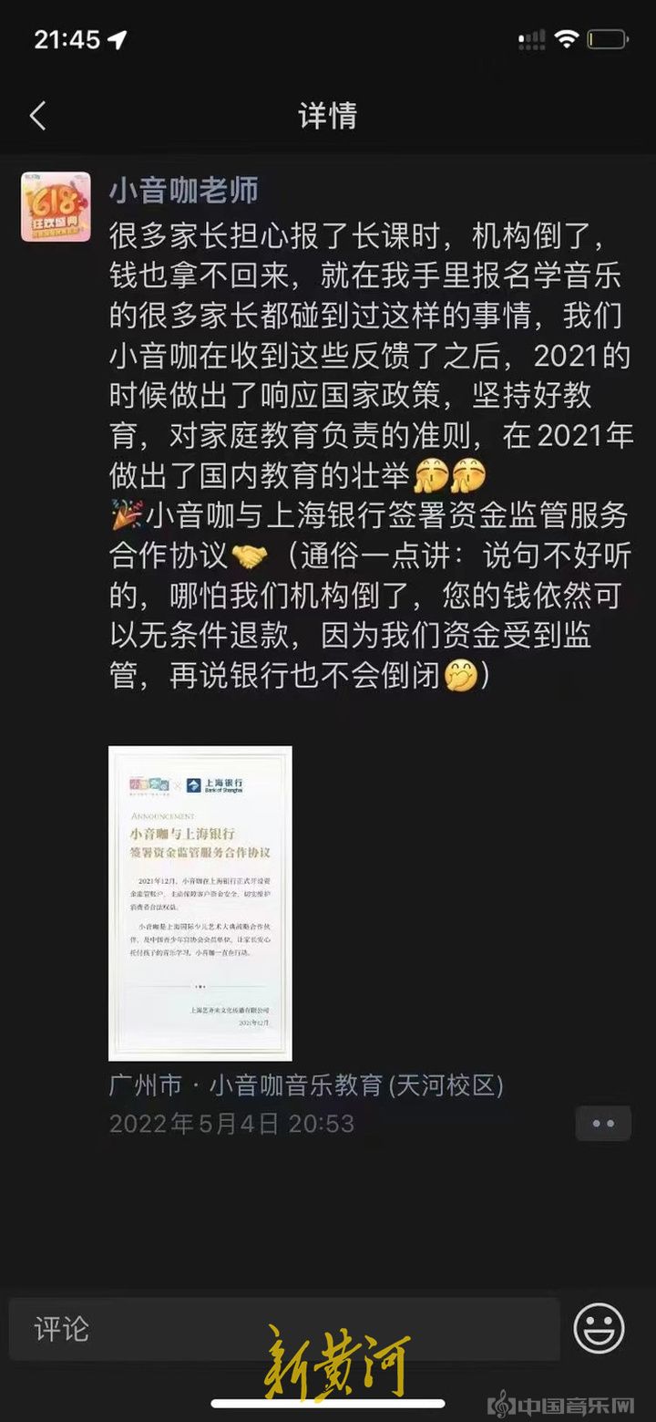 在小音咖过往的宣传中,最为亮眼的当属自称拥有“国资”背景,且由上海银行对其资金进行监管,但同时也引发过相关质疑。公开信息显示,小音咖的音乐培训业务一直在上海,在沪共有14家校区,直到去年下半年,小音咖在广州开办了首个校区。有家长曾在社交平台上表示,小音咖的学员总数或超万人,每人的报名费从1万至十几万不等。