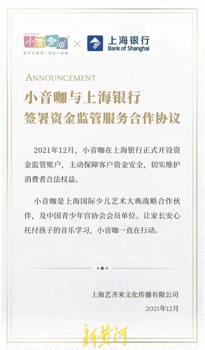 然而,小音咖停课风波掀起后,有家长求证上海银行,得到的回复是这仅仅是个框架协议,并没有落地。今年年初也讨论过推进监管专户系统运行等具体方案,但因疫情影响,相关的工作推迟了,目前尚未正式实行资金监管。也就是说,小音咖收取的所有课时费均还没有经过上海银行。新黄河记者联系到上海银行,一位工作人记录了记者的相关信息后,表示后续会作答复。