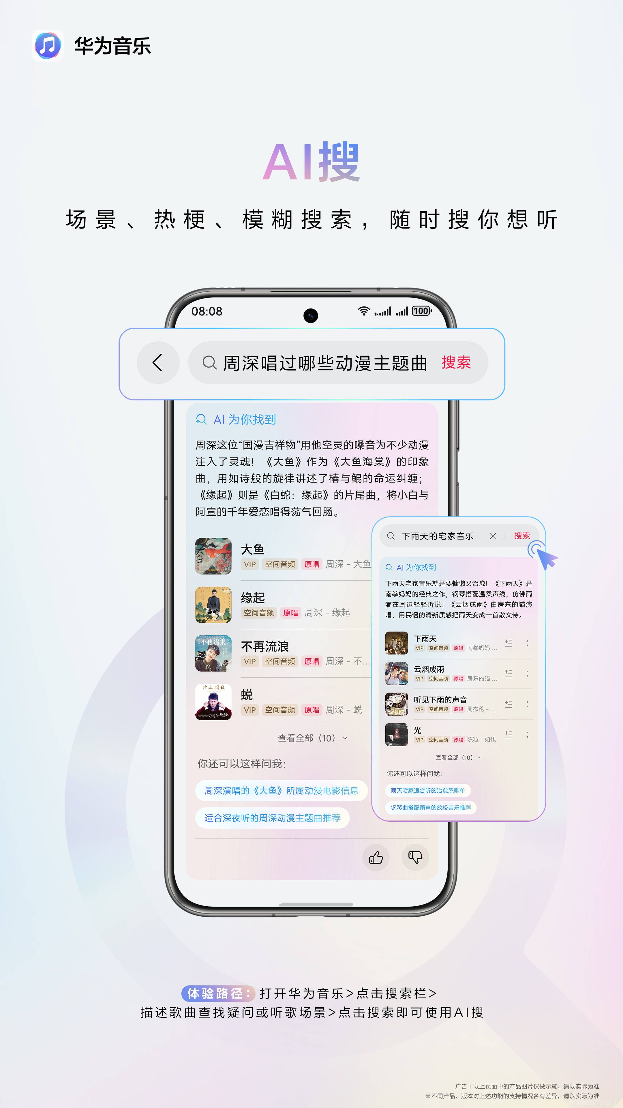 相信不少人都有类似困扰:依稀记得“2025年春晚有首好听的歌曲”“周深唱过的动漫主题曲”,但就是想不起歌名。华为音乐的“AI搜”功能,依托强大的跨域内容知识库和大模型语义理解等能力,能秒懂需求并精准找到那首“说不出名字但就是想听”的歌;基于角色、情节、画面等产生的需求,都能被转化为对应的歌曲列表。