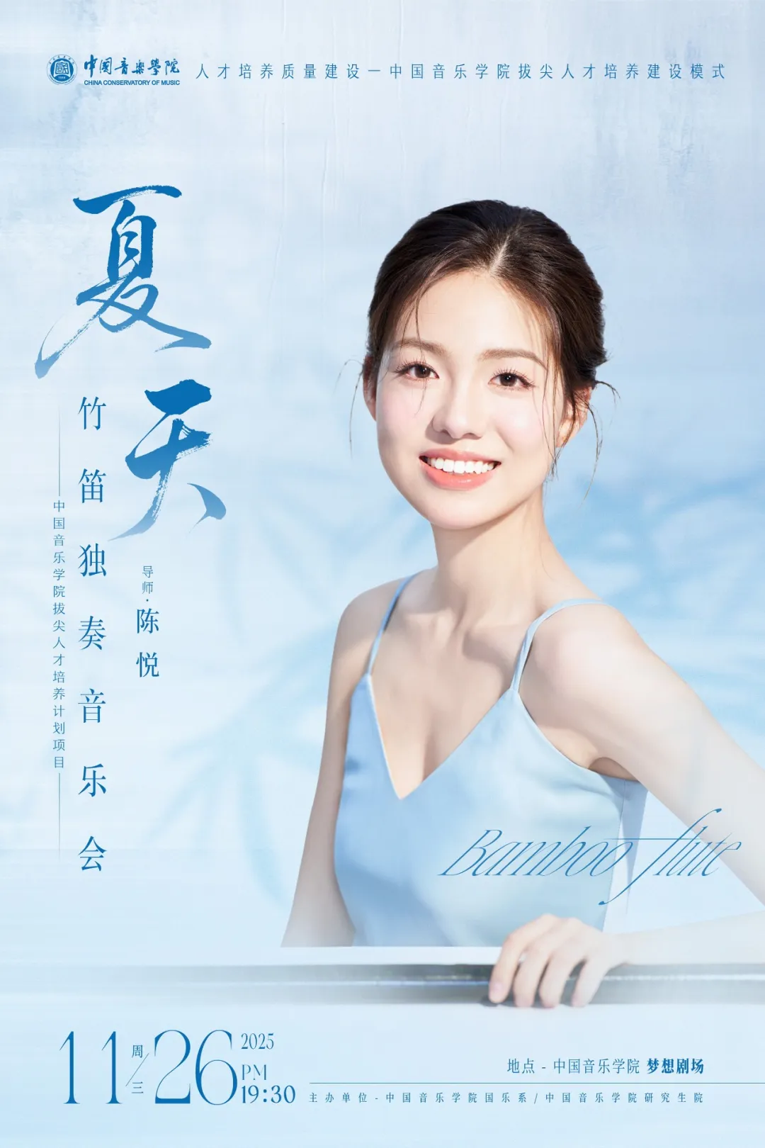 中国音乐学院拔尖人才培养计划项目夏天竹笛独奏音乐会2025年11月26日 19:30中国音乐学院·梦想剧场导师:陈悦主办:中国音乐学院国乐系、
