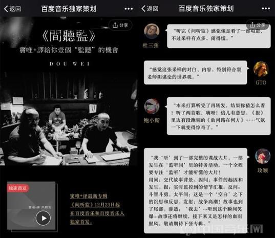 23日专辑首发后,百度音乐就发起了“窦唯+译给你一个‘监听’的机会”专题活动,引导用户发布从《间听监》中“监听”到的内容评论,不少人都在专题后留下了自己的感受。