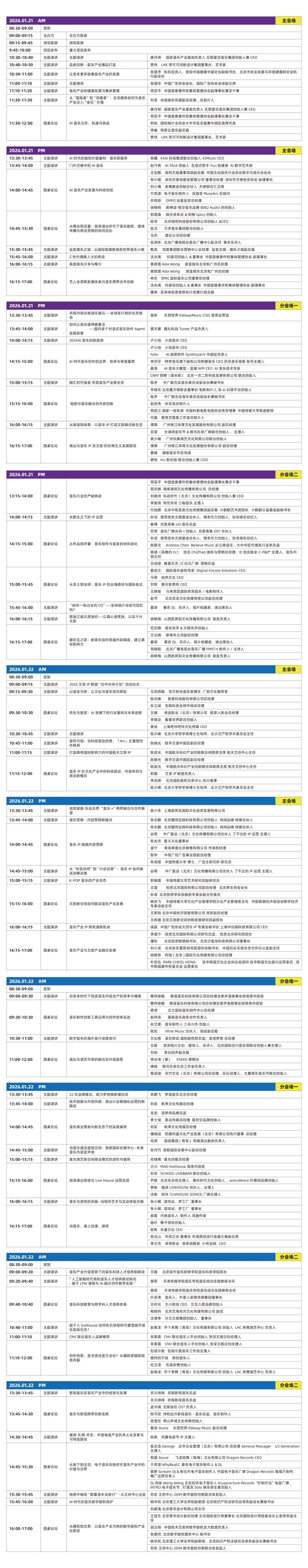大会紧扣时代脉搏,设置超 20 +组深度议题,层层解构产业变革方向。既有 “AI 音乐创作与版权重构”“生成式 AI 对创作生态的影响” 等前沿趋势探讨,也涵盖现场演出文旅融合、数字音乐海外发行、中小音乐人扶持等现实议题。主会场聚焦宏观变革,分会场深挖垂直领域,全方位呈现产业创新成果。