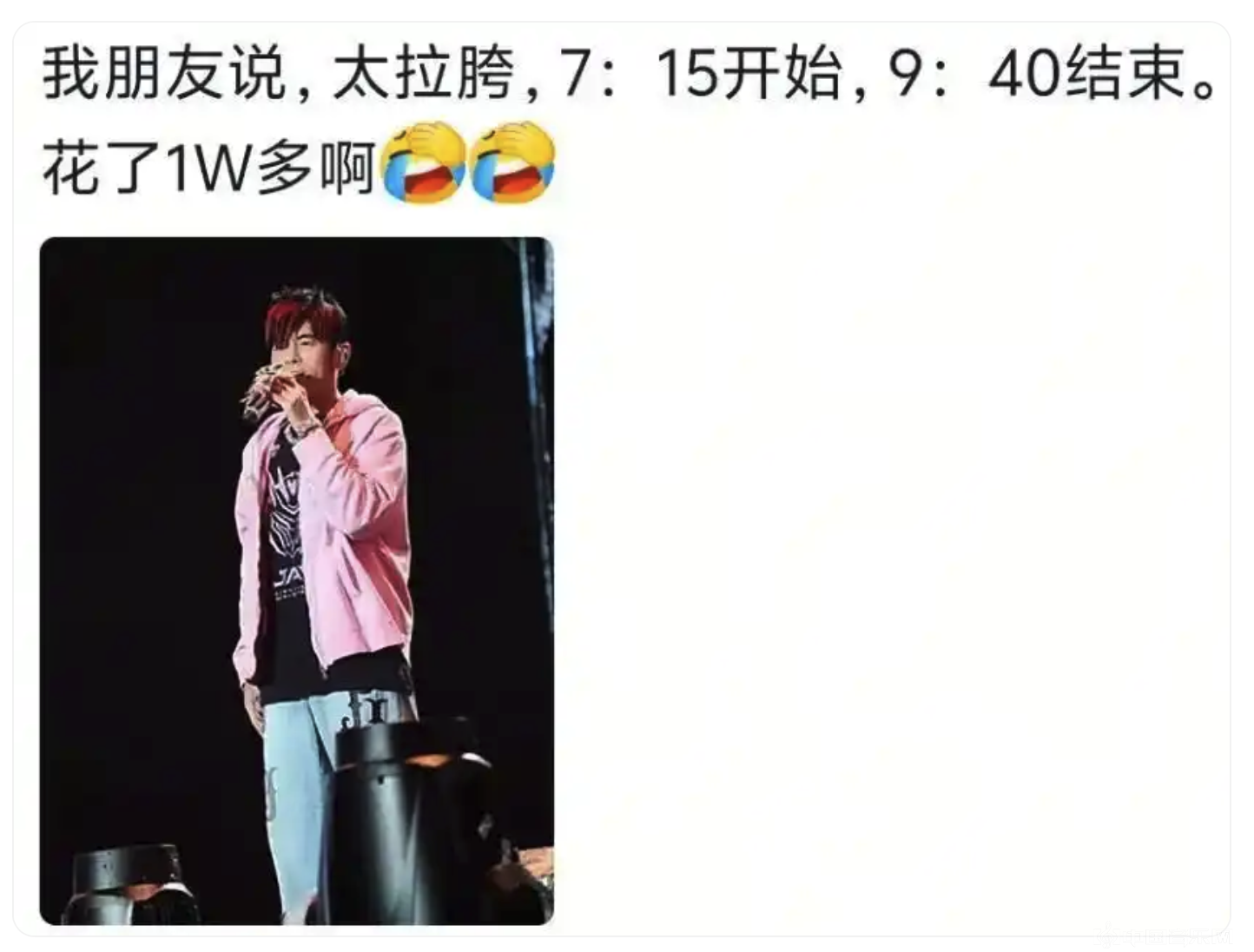 可当开场新歌《太阳之子》那句“我就是光”点燃全场的尖叫与泪光后,很多人心里的光,很快就熄灭了。 散场时,社交媒体上充满了心碎的声音。 有人说:“卖最贵的票,划最大的水。 ”有人说:“我可以接受他胖了、老了,但我接受不了的是,3小时你还光明正大划水2个小时。 ”更扎心的是这句:“从小到大只喜欢周杰伦这个歌星,去年在香港看了他的演唱会,真的感觉很失望但是也不敢说,因为他真的是我的青春,只是不会再去了。 ”