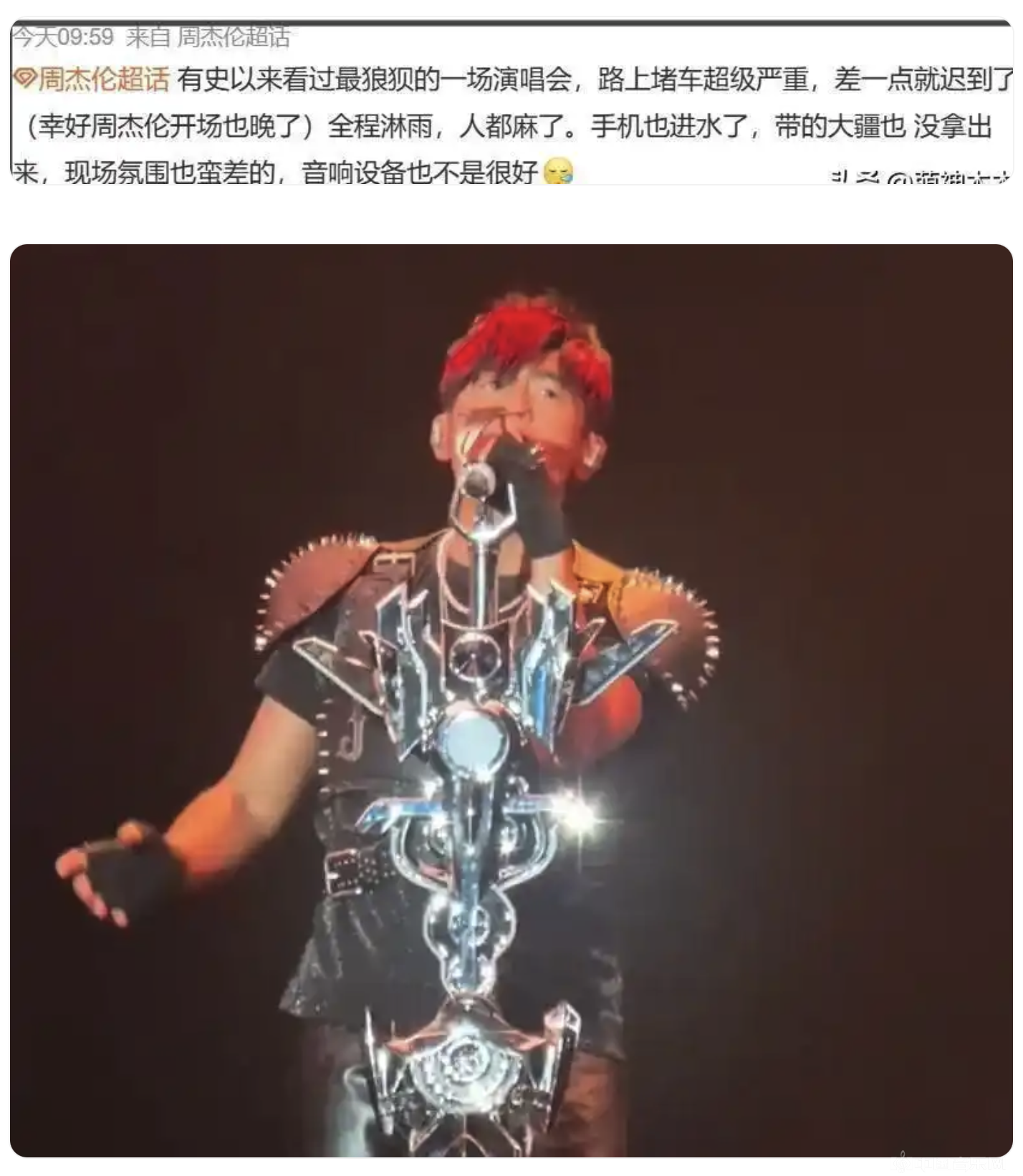 (来源:百家号-北溟有娱 47岁周杰伦杭州演唱会“翻车”?暴雨中3小时被曝真唱不足1小时,唱不上去竟划水)
