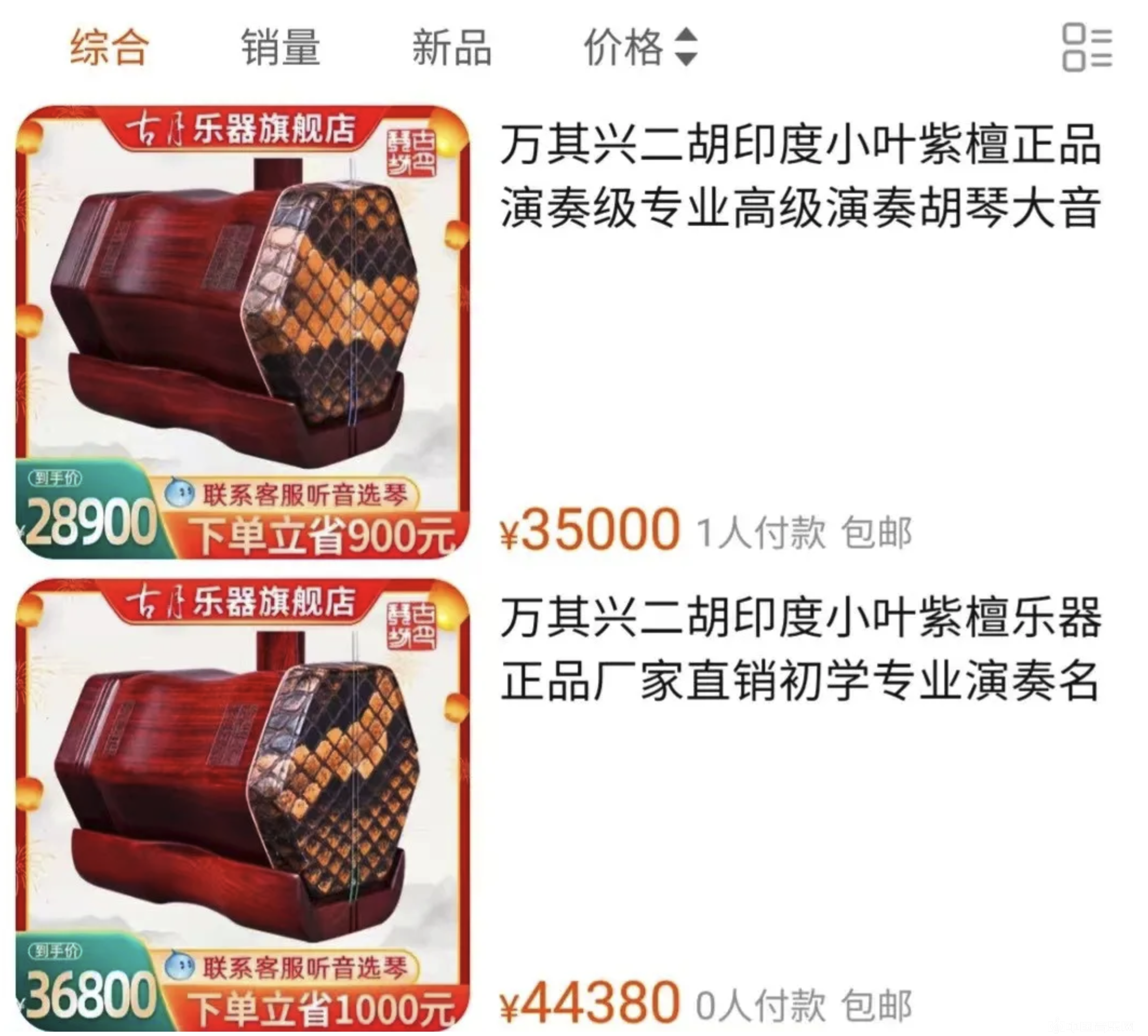 目前,在淘宝官网上古月琴坊收藏级别的二胡能卖到3万元-4万元一把,演奏级别的二胡则在7千元—1万元左右。