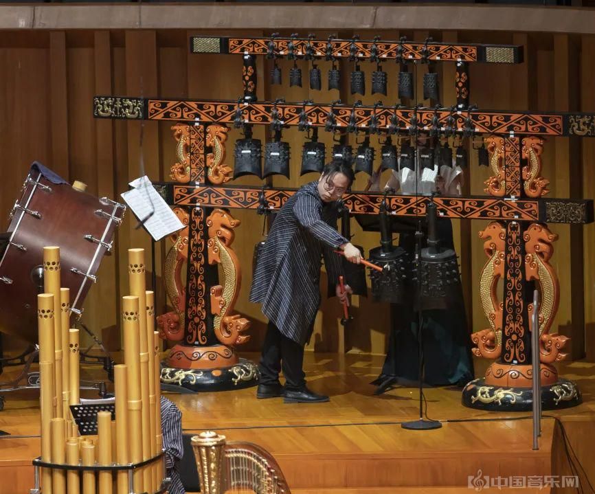 当晚音乐会压轴曲为指挥家、作曲家关逎忠创作的《盛世华章》。这部作品创造性地运用了两个编钟与管风琴合作的乐队编配。来自中国古代和西方教堂的两种乐器和国乐团同时奏响,古今混响,中西交融,乐声萦绕在音乐厅,雍容大气。钟鼓齐鸣,弦瑟交织,乐曲在编钟悠长绕梁的余韵中收尾。
