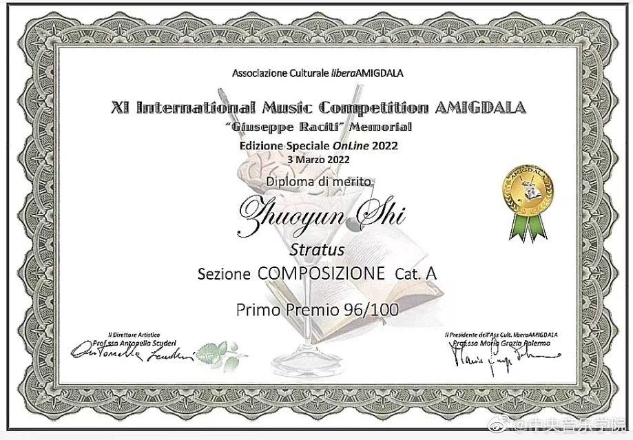近日,中央音乐学院作曲系施卓芸同学在2022年意大利阿米格达拉纪念“朱塞佩•拉奇蒂”国际音乐比赛中获奖。