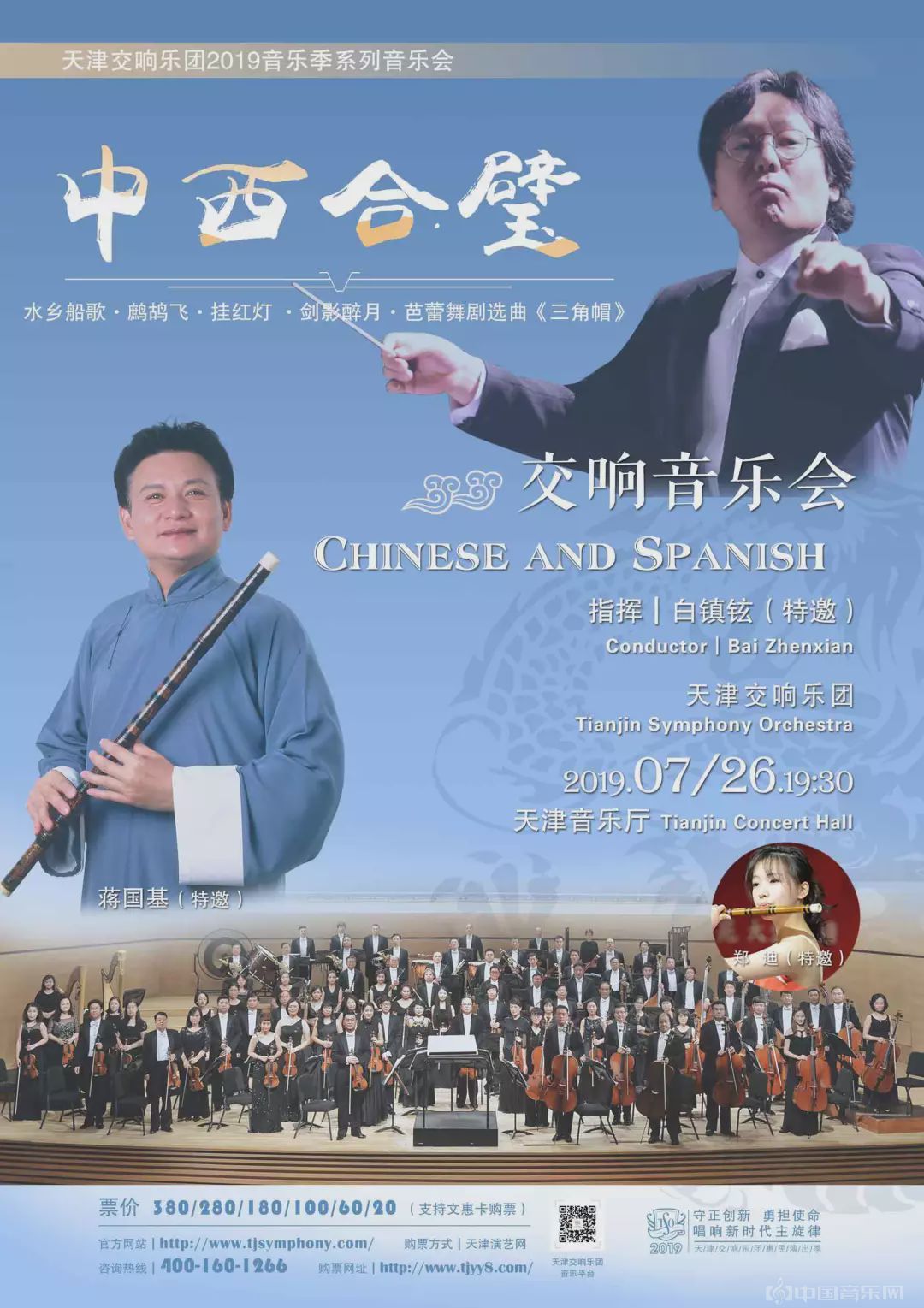 7月26日,天津交响乐团与韩国指挥家白镇铉、竹笛名家蒋国基、新生代竹笛演奏家郑迪合作,演奏“中西合璧交响音乐会”。中国传统音乐《水乡船歌》《鹧鸪飞》《挂红灯》《剑影醉月》,以及西班牙作曲家法雅的《三角帽》选曲等中外作品的不同曲风展现出独特情感,带给大家轻松愉悦的古典音乐享受。
