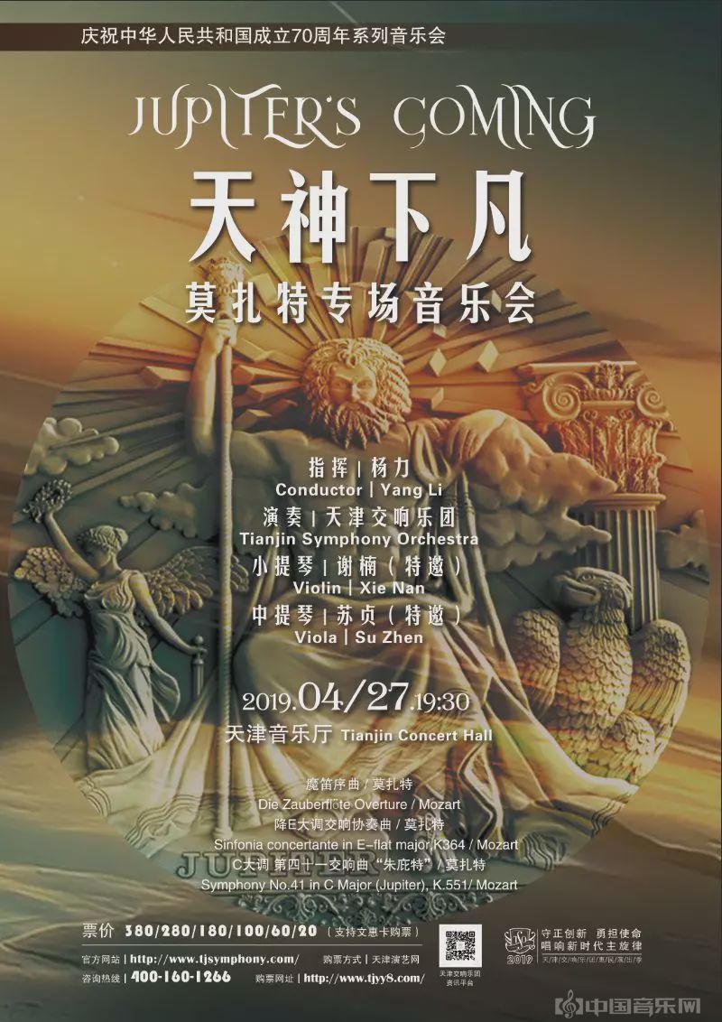 4月27日,天交与常任指挥杨力合作,特邀小提琴演奏家谢楠与中提琴演奏家苏贞,在天津音乐厅以“天神下凡”为音乐主题,联袂演绎莫扎特用交响乐塑造出的“众神之王”朱庇特,用美妙灵动的旋律向这位音乐天才致敬。