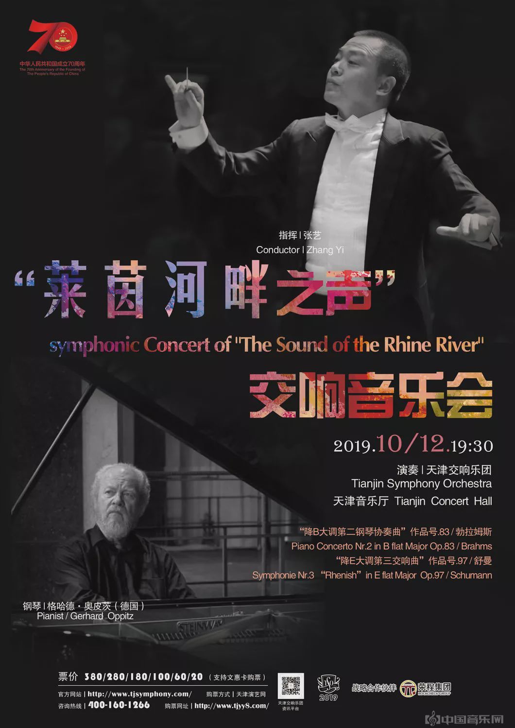 10月12日,天津交响乐团携手著名指挥家张艺、德国著名钢琴家格哈德·奥皮茨,在天津音乐厅奏响了“莱茵河畔之声”交响音乐会,再现了勃拉姆斯《第二钢琴协奏曲》与舒曼《降E大调第三交响曲》两部经典作品。