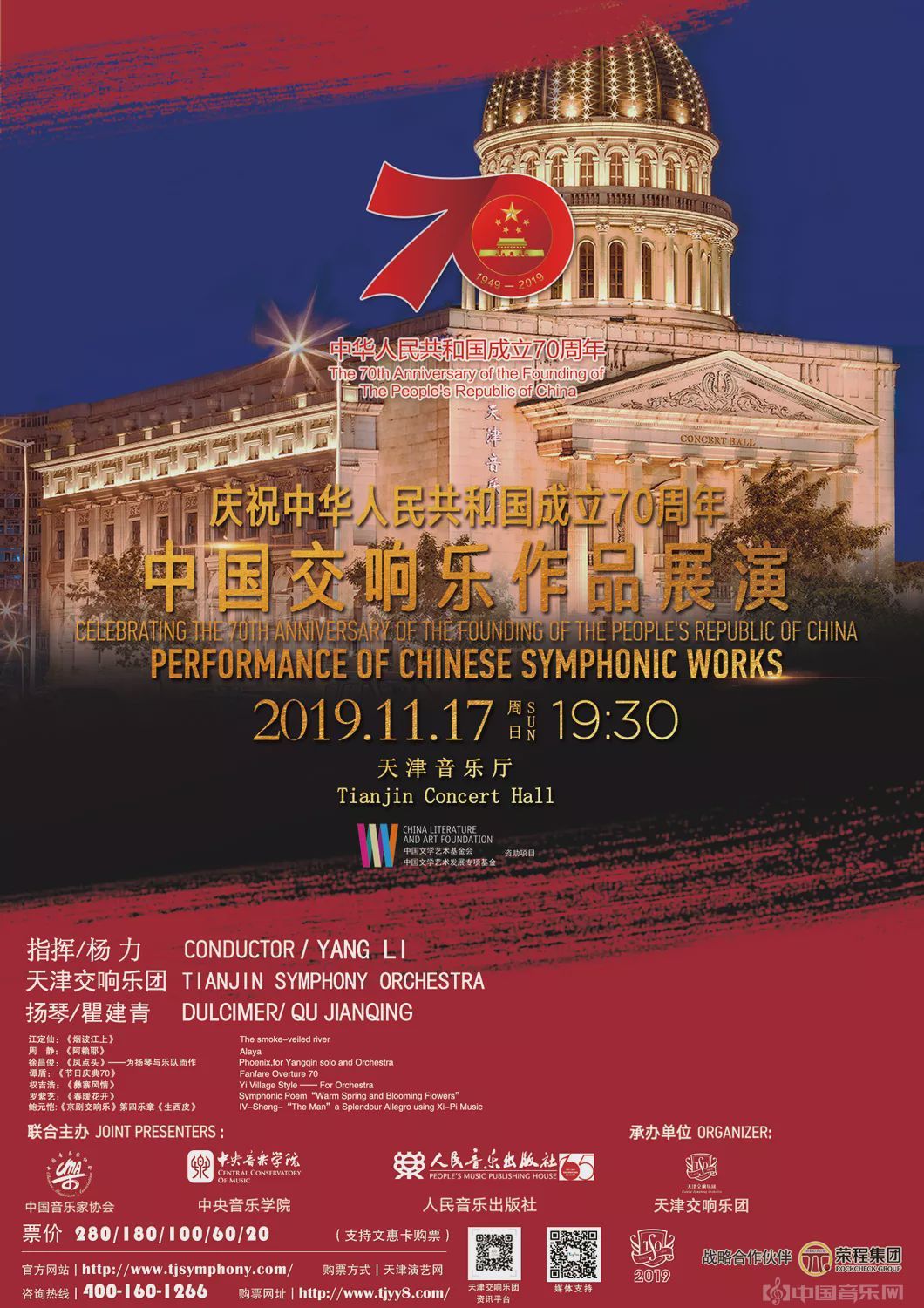 11月17日,为庆祝新中国成立70周年,展示中国作曲家的交响乐创作成果,由中国音乐家协会、中央音乐学院、人民音乐出版社联合主办,天津交响乐团承办的“庆祝中华人民共和国成立70周年──中国交响乐作品展演”音乐会在天津音乐厅上演。演出由指挥家杨力执棒,为观众带来了江定仙、周静、徐昌俊、谭盾、权吉浩、罗紫艺、鲍元恺等7位中国当代作曲家的优秀交响乐作品,展示出新中国成立以来中国交响音乐的创作精粹。