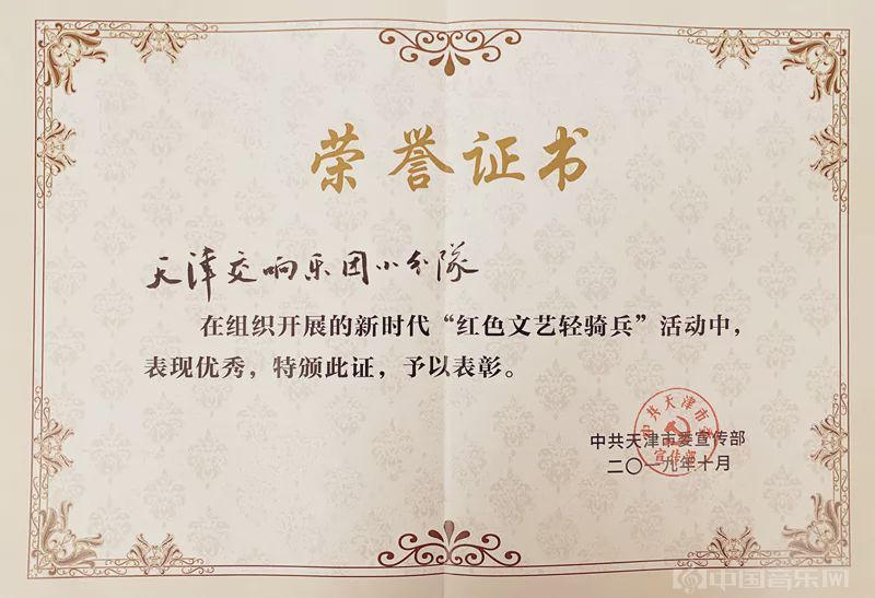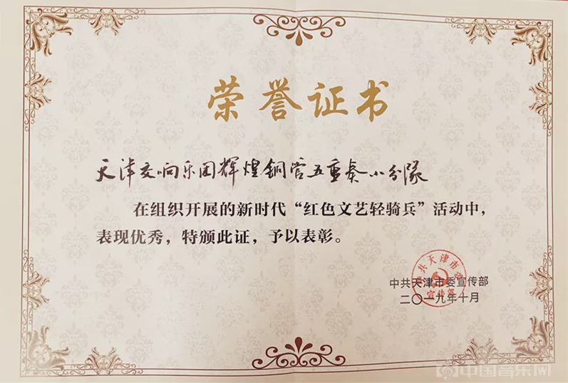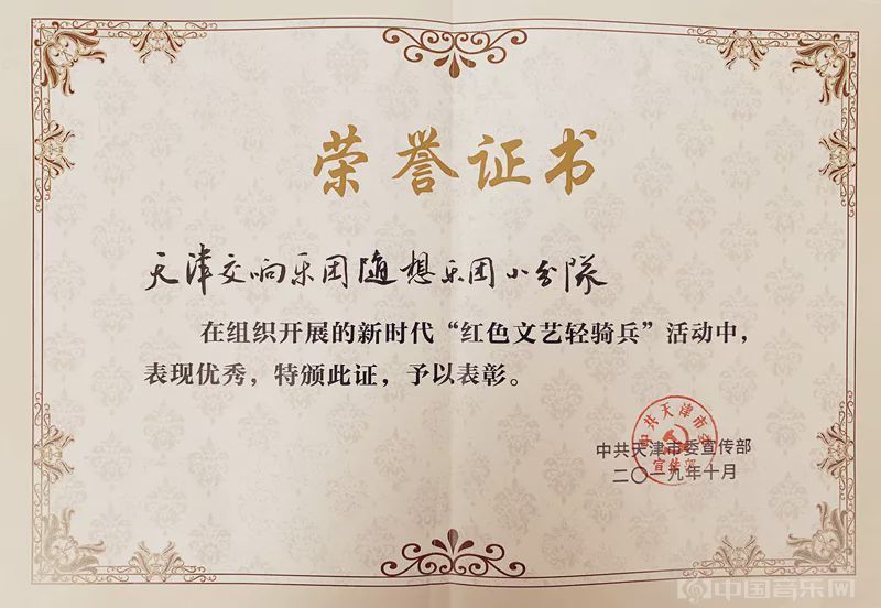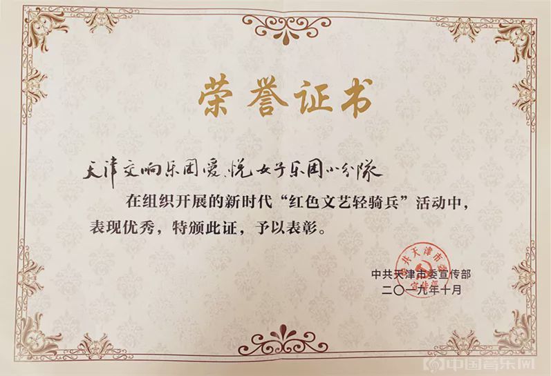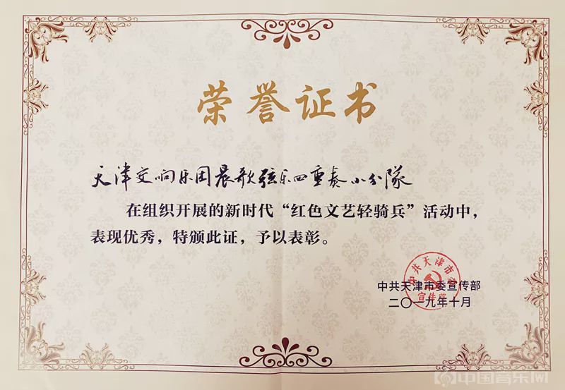 今年,在中共天津市委宣传部组织开展的新时代“红色文艺轻骑兵”活动中,以“爱·悦女子乐团”、“晨歌弦乐四重奏”、“辉煌铜管五重奏”、“随想乐团”为代表的天津交响乐团小分队艺术家们表现优秀,为天交一举荣获五本荣誉证书。