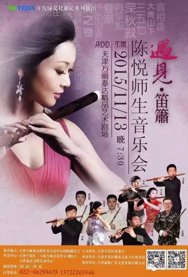 11月13日晚19:30分,陈悦师生笛子音乐会将在天津万丽泰达精品艺术剧场举办。中国音乐学院民乐系副教授陈悦和她优秀的学生们将携手为观众奉献了一场风格多样、作品多元、质朴感人的音乐盛宴。在曲目的安排上,音乐会既有传统曲目,也有高难度的现代笛子协奏曲,将带领大家从古典到走向时尚,感受不同时代、不同地域笛乐语言的独特魅力。陈悦全国笛子研修班的学员可免费参加陈悦师生笛子音乐会。