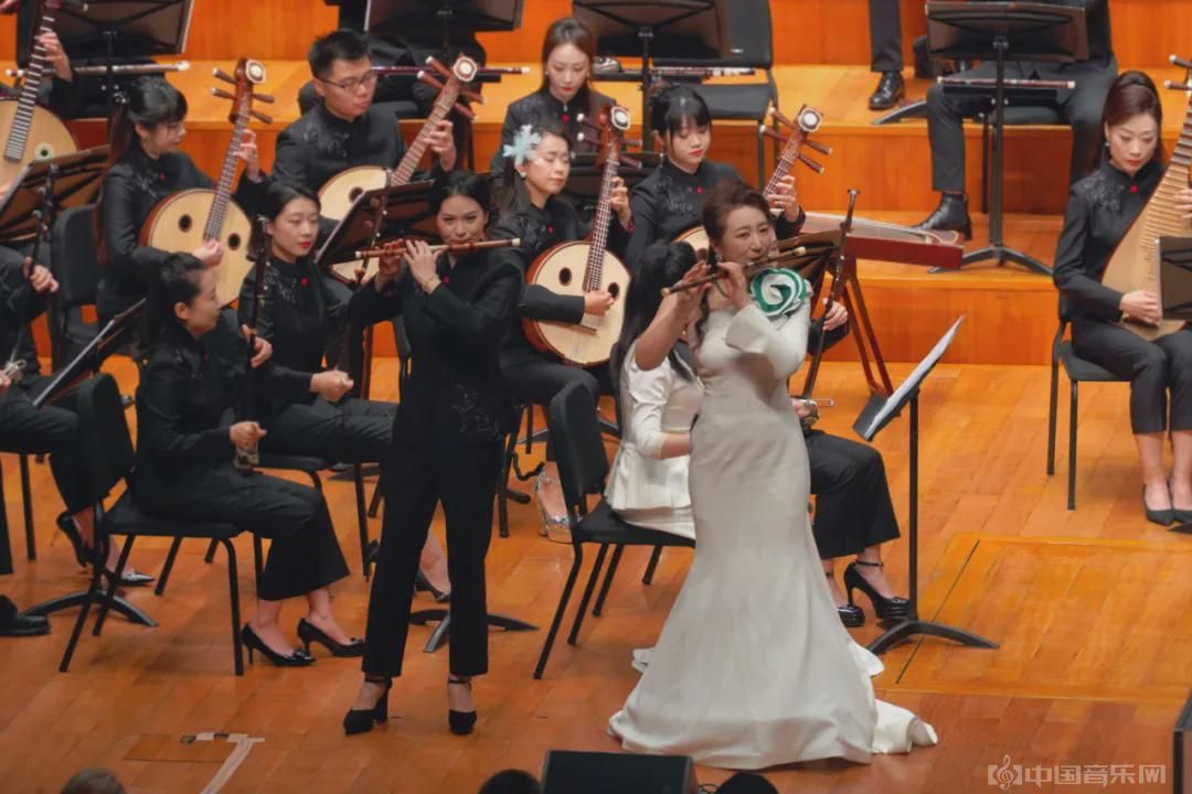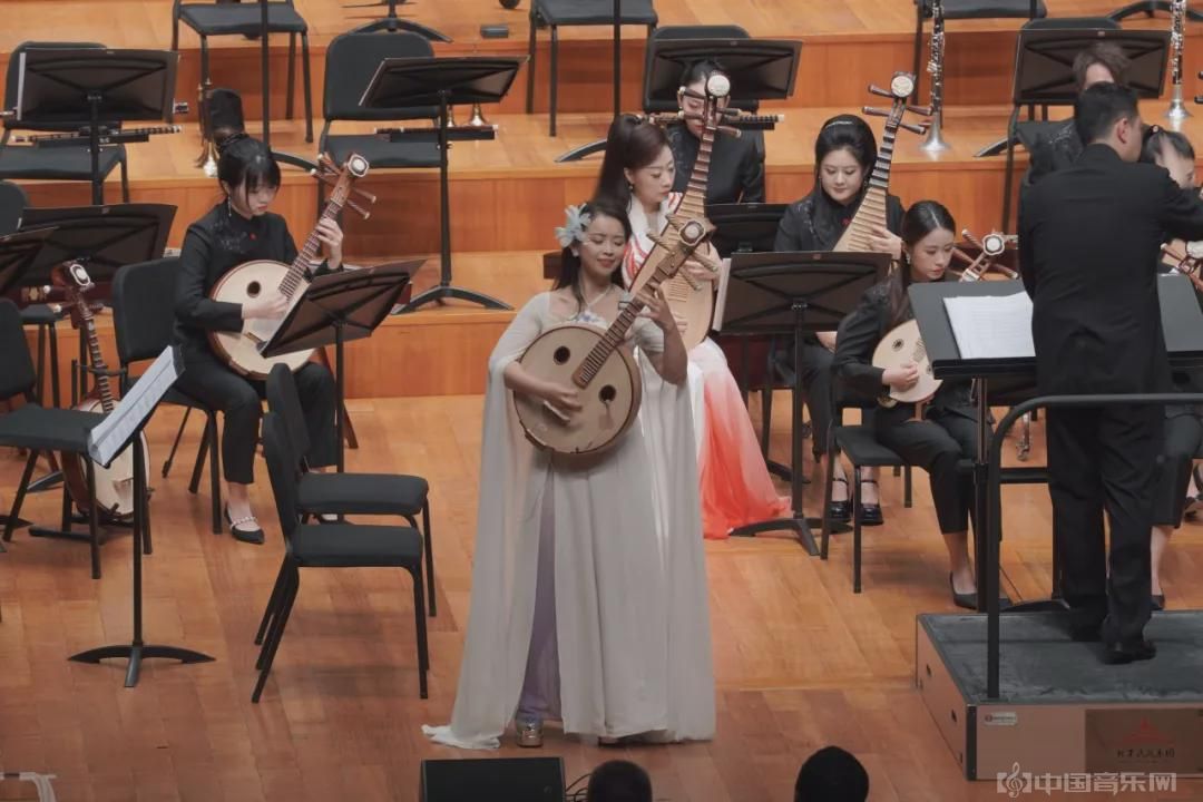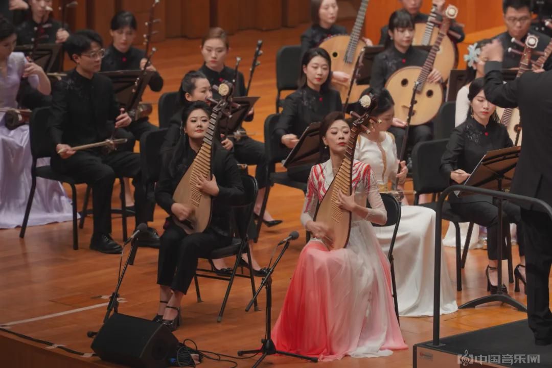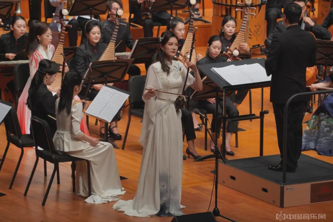 与其他作品不同的是,在《山歌》的演奏当中,中阮首席李雨涵选择了小乐队伴奏,自己站立弹奏的表演方式,充满动感,给现场观众带来了不同的感受。