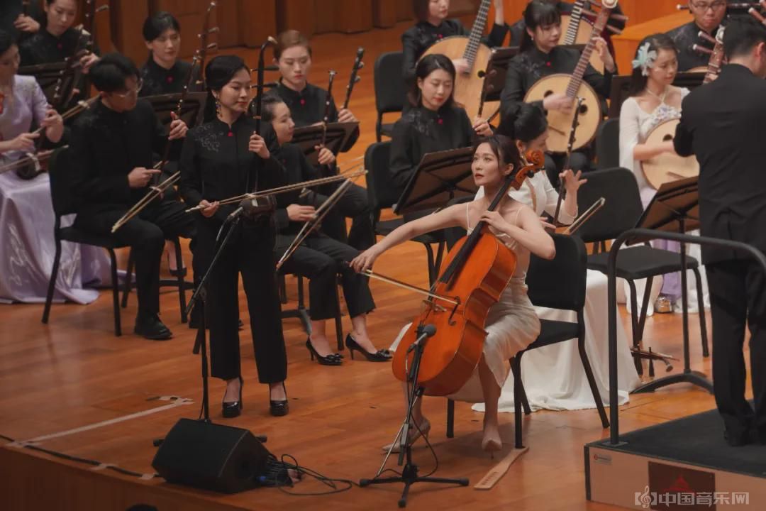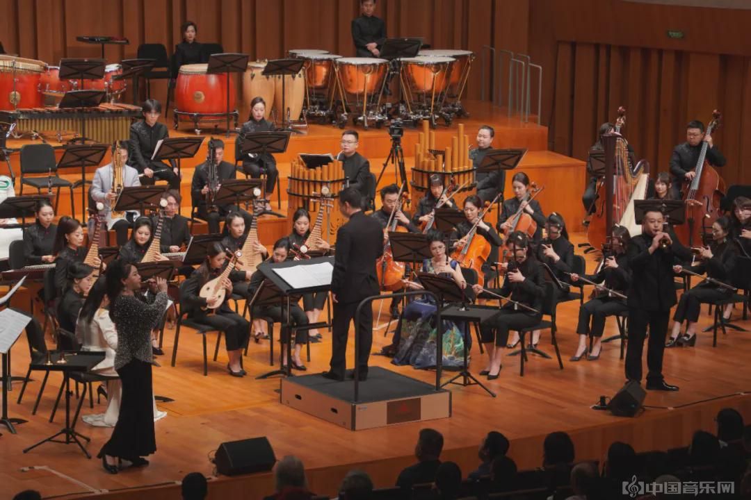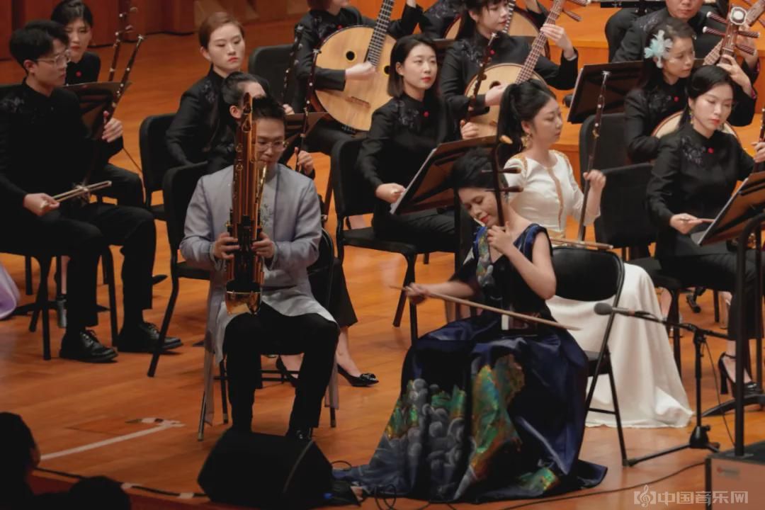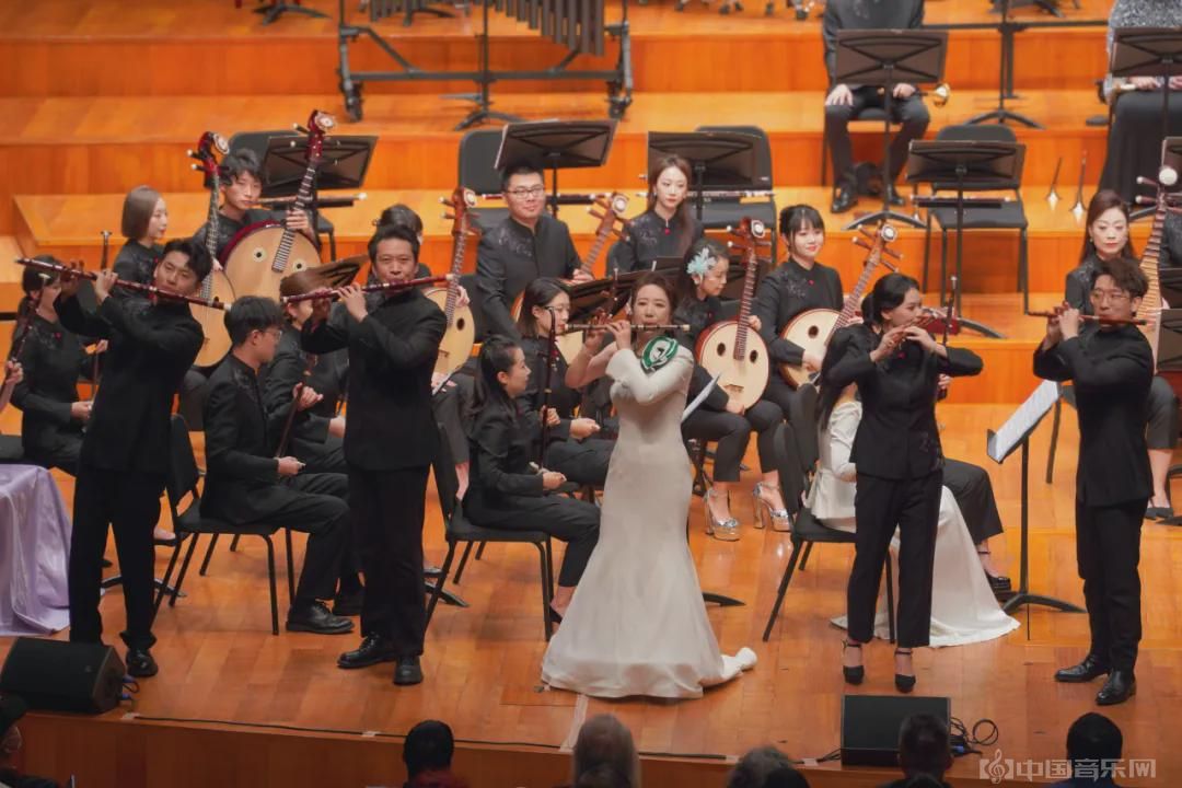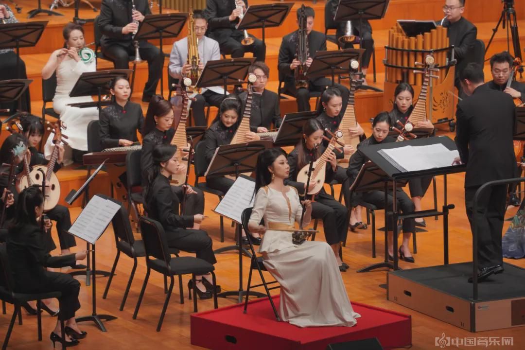 与其他作品不同的是,在《山歌》的演奏当中,中阮首席李雨涵选择了小乐队伴奏,自己站立弹奏的表演方式,充满动感,给现场观众带来了不同的感受。