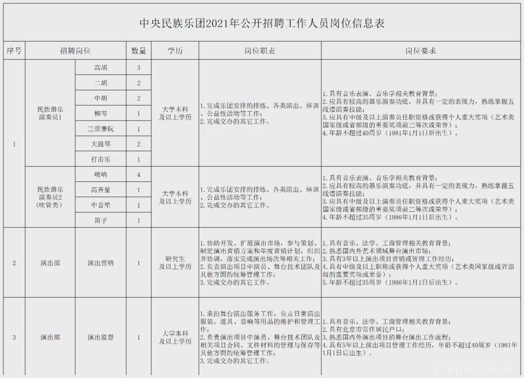 具体请参见《中央民族乐团2021年公开招聘工作人员岗位信息表》。