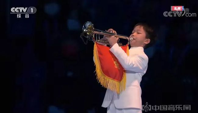 在国旗传递的同时,一名小男孩站在旗杆下,用小号吹响了嘹亮深情的《我和我的祖国》,他是北京师范大学实验小学未来科技城学校的学生朱德恩。
