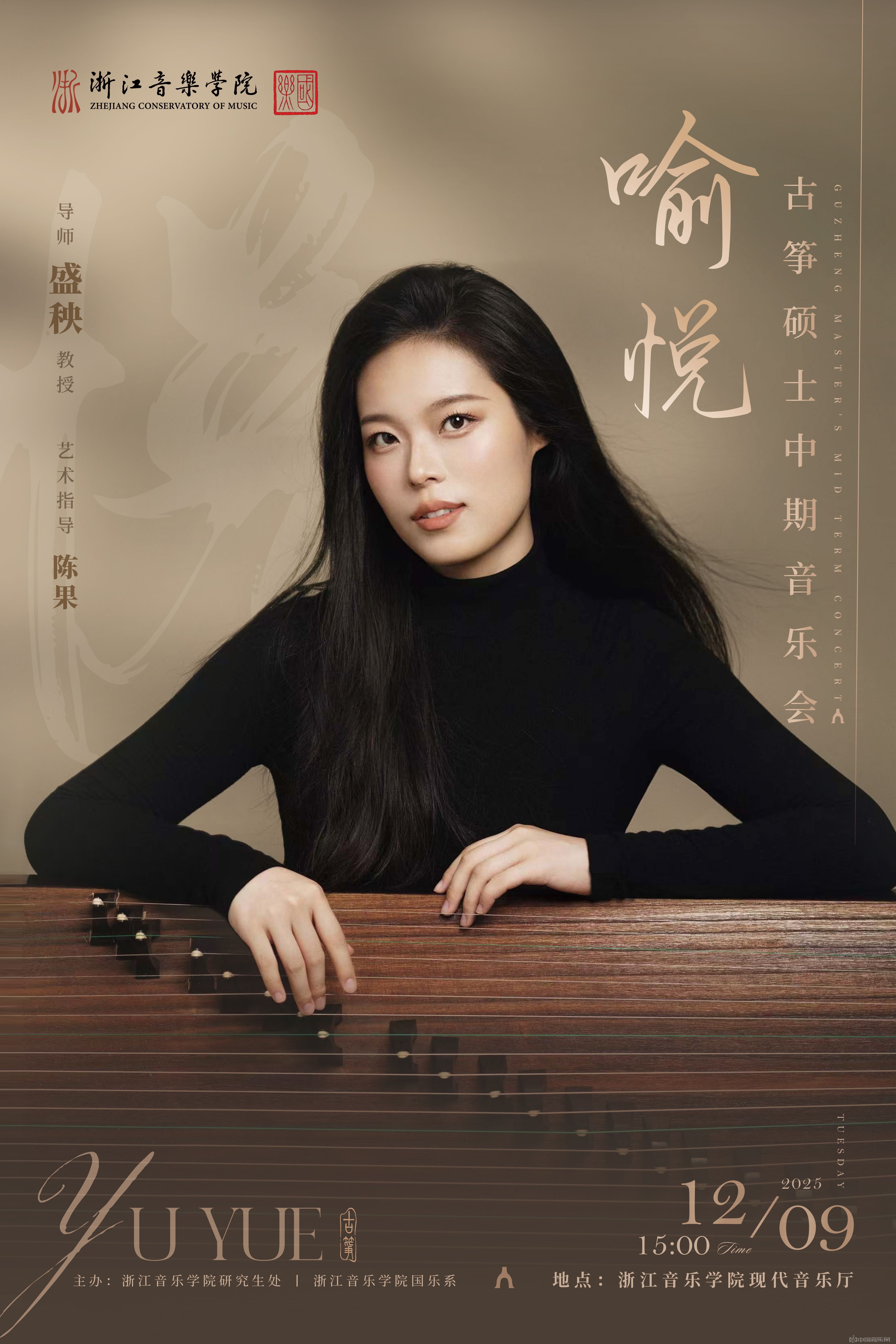 喻悦古筝硕士中期音乐会2025年12月9日 15:00浙江音乐学院现代音乐厅导师:盛秧 教授艺术指导:陈果主办:浙江音乐学院研究生处、国乐系媒