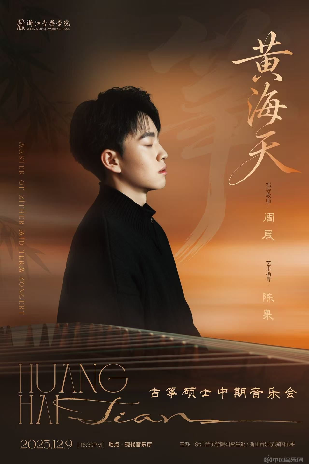 黄海天古筝硕士中期音乐会2025年12月9日 16:30浙江音乐学院现代音乐厅指导教师:周展艺术指导:陈果主办:浙江音乐学院研究生处、国乐系媒
