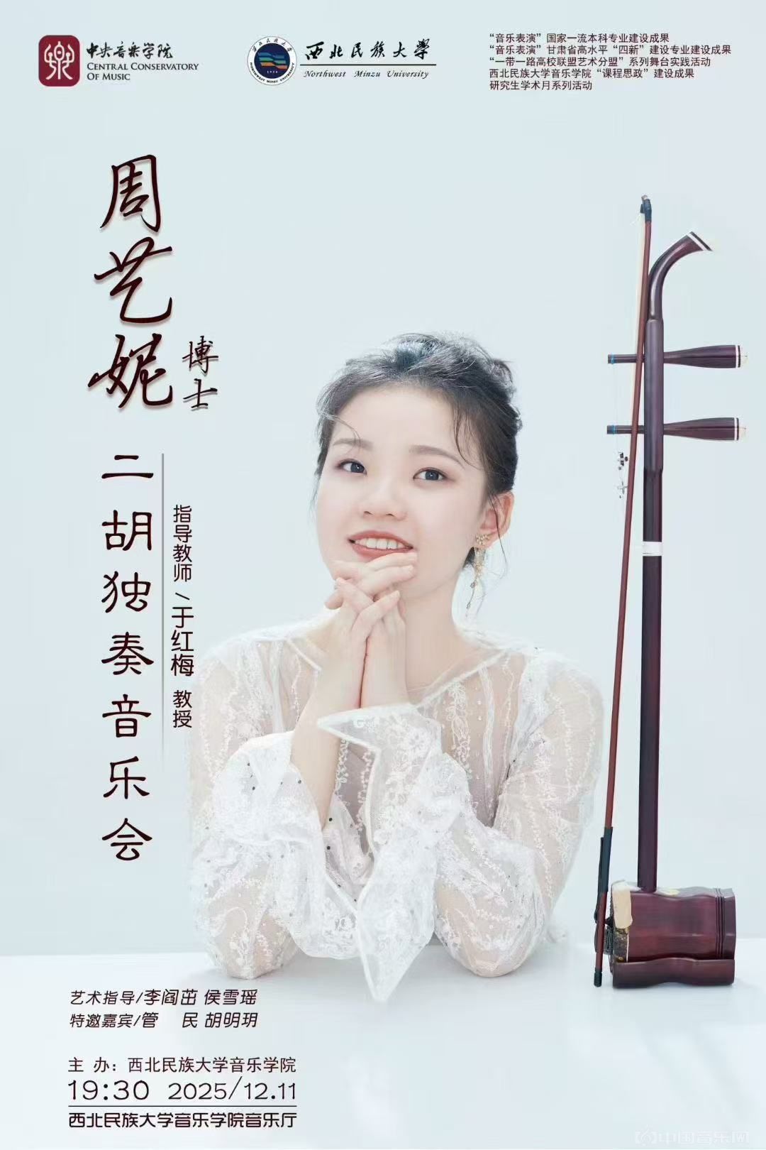周艺妮博士二胡独奏音乐会2025年12月11日 19:30指导教师:于红梅 教授艺术指导:李阎茁、侯雪瑶特邀嘉宾:管民、胡明玥西北民族大学音乐