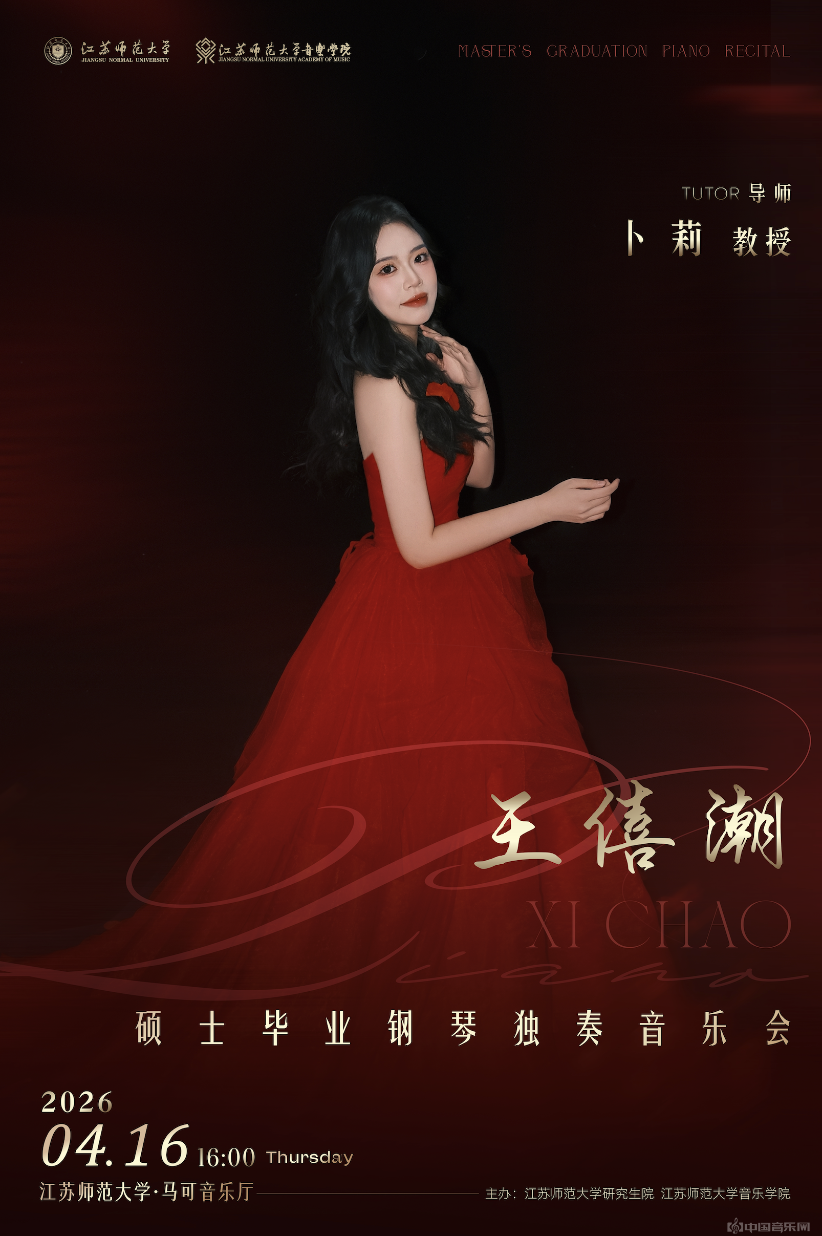 江苏师范大学2023级专业学位硕士研究生王僖潮硕士毕业钢琴独奏音乐会2026年4月16日 16:00江苏师范大学马可音乐厅导师:卜莉 教授主办单位