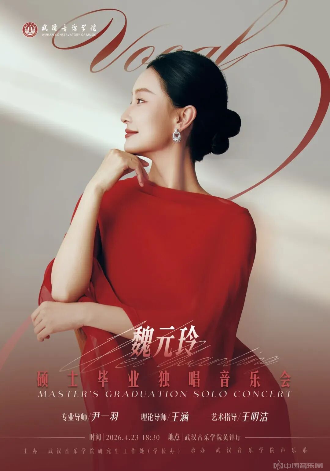 魏元玲硕士毕业独唱音乐会2026年4月23日 18:30武汉音乐学院(滨江校区)黄钟厅专业导师:尹一羽理论导师:王涵艺术指导:王明洁主办:武汉
