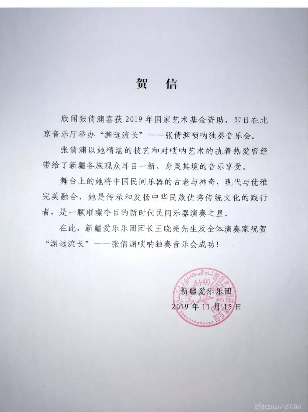 此次音乐会收到新疆爱乐乐团发来的贺电: