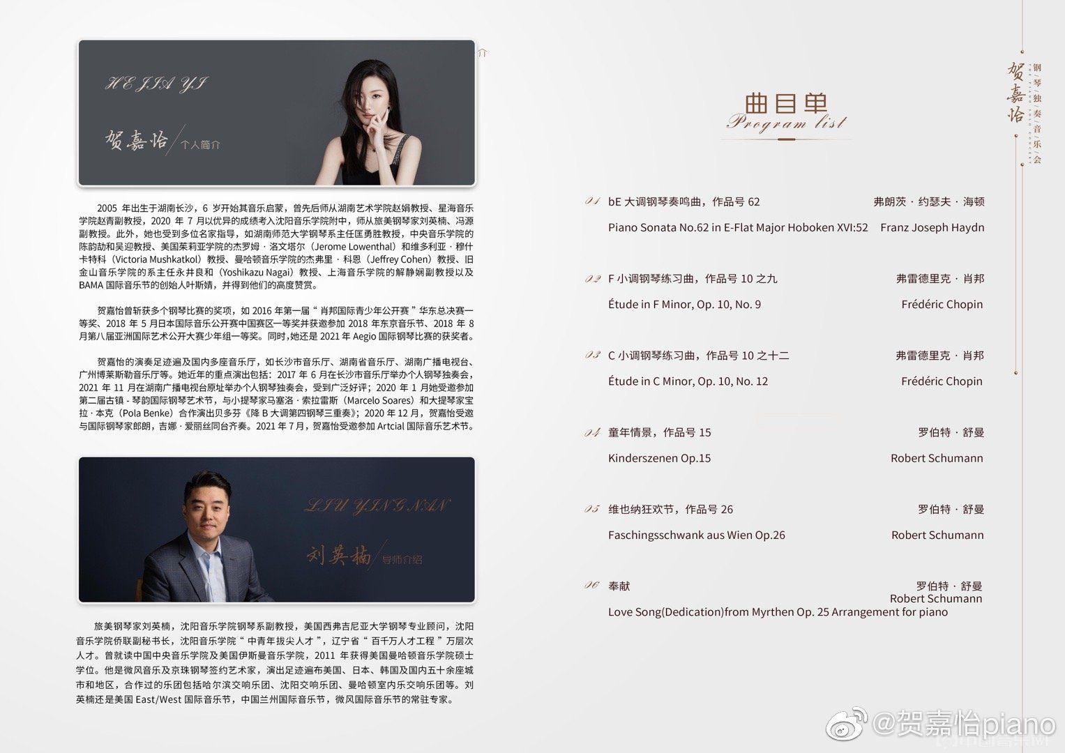 贺嘉怡,2005年6月3日出生于湖南长沙,6岁开始学琴至今,曾先后师从湖南艺术学院赵娟教授、星海音乐学院赵青教授。
